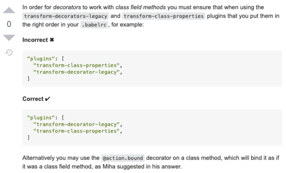 // transform-decorators-legacy 의 순서가 가장 아래에 있음.