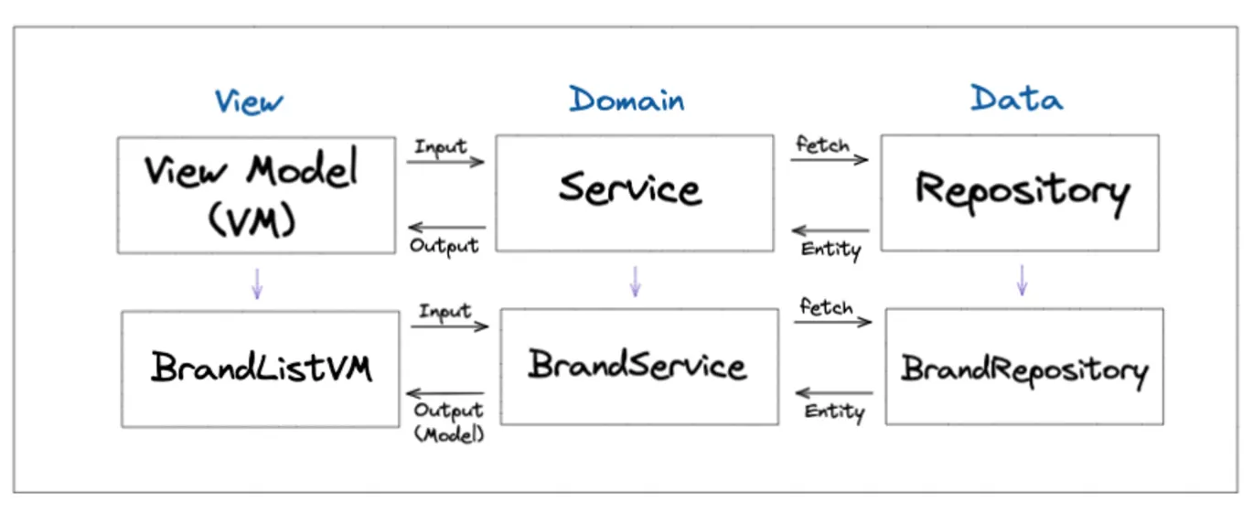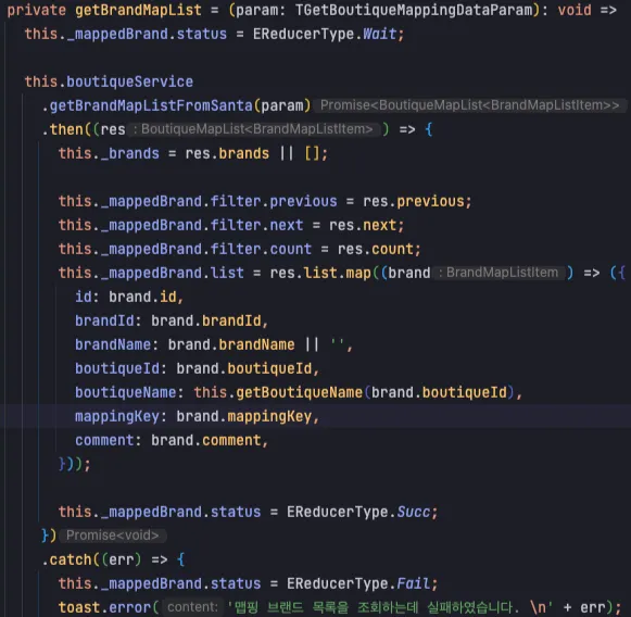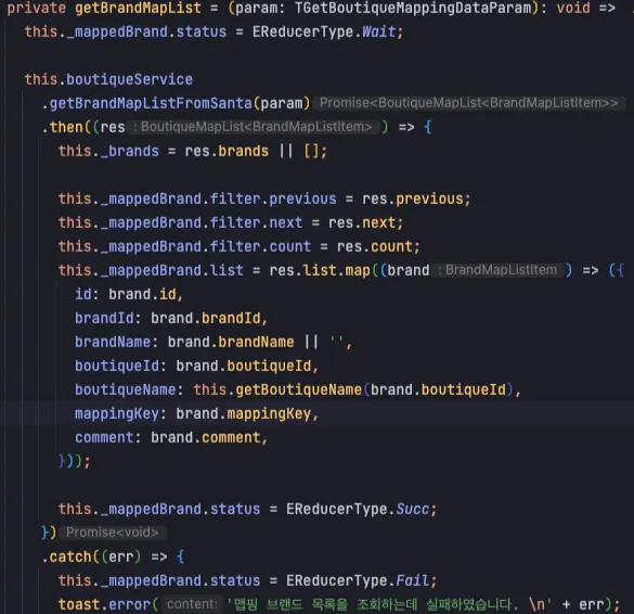 BoutiqueService로부터 Model을 전달 받고 Model을 ViewModel로 맵핑하는 작업을 하고있다. 추가로, brand 목록도 동시에 받고 있네요.