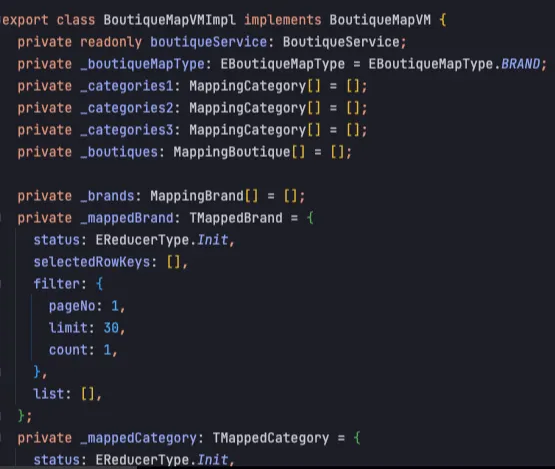 먼저, 저희가 테스트해야할 페이지에서 사용하는 기능들은 전부 BoutiqueMapVM 을 이용합니다. 따라서 실제 코드를 확인해봅시다.