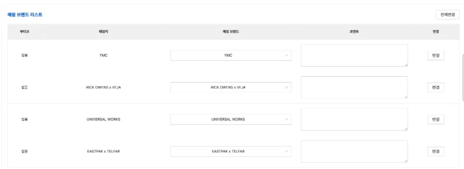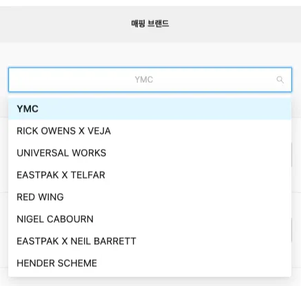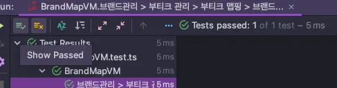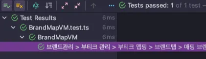 매핑 브랜드 셀렉박스 변경 : 매핑 브랜드영역에서 셀렉박스를 클릭했을 때 불리는 이벤트를 테스트합니다. 여기서 브랜드를 선택했을 경우, VM에 정의된 상태가 변경되는지 테스트합니다.