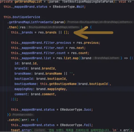 아까 구현부에서 initPage를 호출 했을 경우 최종적으로 VM 내부에 있는 this._mappedBrand 가 변경되었을 것입니다.
