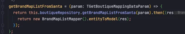 먼저 위 내용으로 확인해보면, BoutiqueService의 getBrandMapListFromSanta 라는 메서드를 통하여 모델을 전달받고 있습니다.
