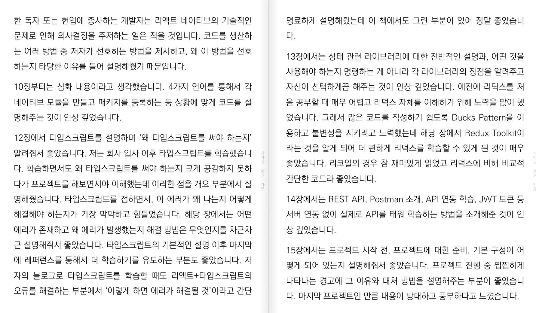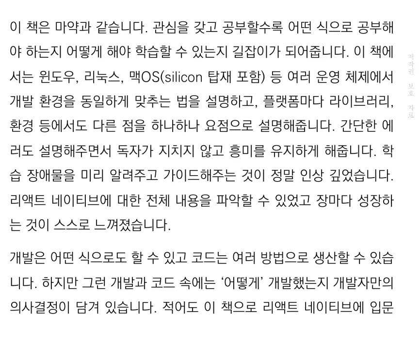 베타테스터를 통해서, 리액트 네이티브를 다루는 기초적인 방법을 습득 했을 뿐만 아니라, 기존 React를 복습하는 경험을 할 수 있었습니다. 또한, 기술 서적이기 때문에 당연히 어떠한 라이브러리를 사용할지에 대해서는 처음 책을 접하는 대상을 위주로 선택되어졌기에 굳이 설명을 할 필욘 없습니다. 하지만 해당 서적에서는 왜 해당 라이브러리를 통해서 실습을 진행하는 이유를 찾아볼 수 있었습니다. 단순히, 개발을 처음 접하는 입장으로서 책을 읽은 것이 아니기 때문에, 이런 부분에 대해서 배울 수 있었습니다.